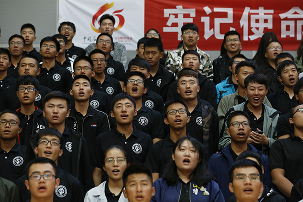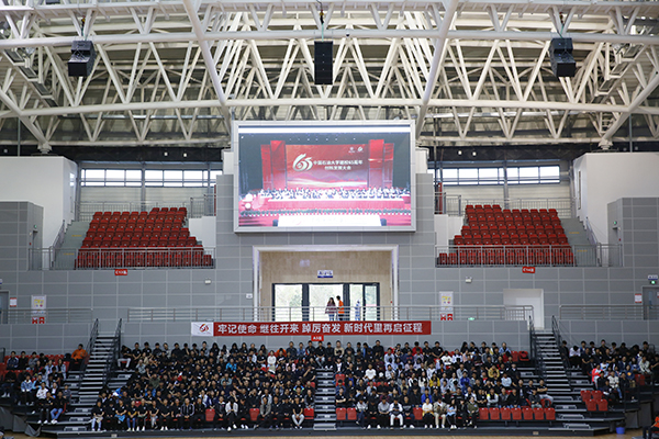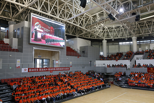 在这个特殊的日子,克拉玛依校区组织全校师生在体育馆集体观看大会直播。同襄盛举,共谱新章,共同祝福石大65周年华诞。