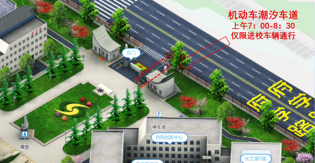 为缓解北校园东门早高峰交通压力,为师生员工驾车入校提供便利。即日起,将北校园北门原机动车出口更改为机动车潮汐车道。每日上午7:00-8:30,潮汐车道仅限进入校园的机动车通行,出校车辆请走东门;其他时间段,潮汐车道仅限驶离校园的机动车通行,进校车辆请走东门。