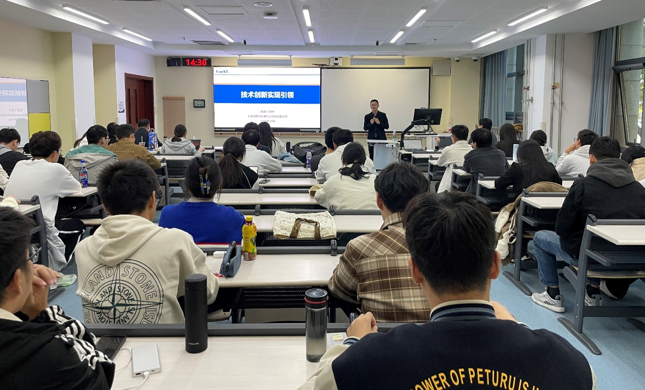 陈高飞博士以两个产品的研发历程为案例,深入浅出地讲述了公司如何利用技术创新实现价值引领。他指出技术创新的出发点不是“拍脑袋”,也不是“自以为是”,更不是“闭门造车”,而是深入发掘用户痛点、市场需求,在与用户的不断沟通中完成产品和技术的迭代更新;同时,紧跟时代前沿技术,抓住市场机遇,积极应变、主动求变,使用AI技术助力公司业务拓展。作为前辈,他嘱咐在场的同学,做好职业规划,成就最好的自己。