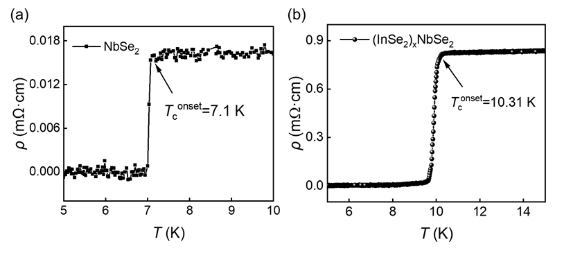 (a)2H-NbSe2单晶的ρ(T)曲线,超导起始转变温度Tconset为7.1 K。(b)(InSe2)xNbSe2单晶的ρ(T)曲线,Tconset为10.31K。