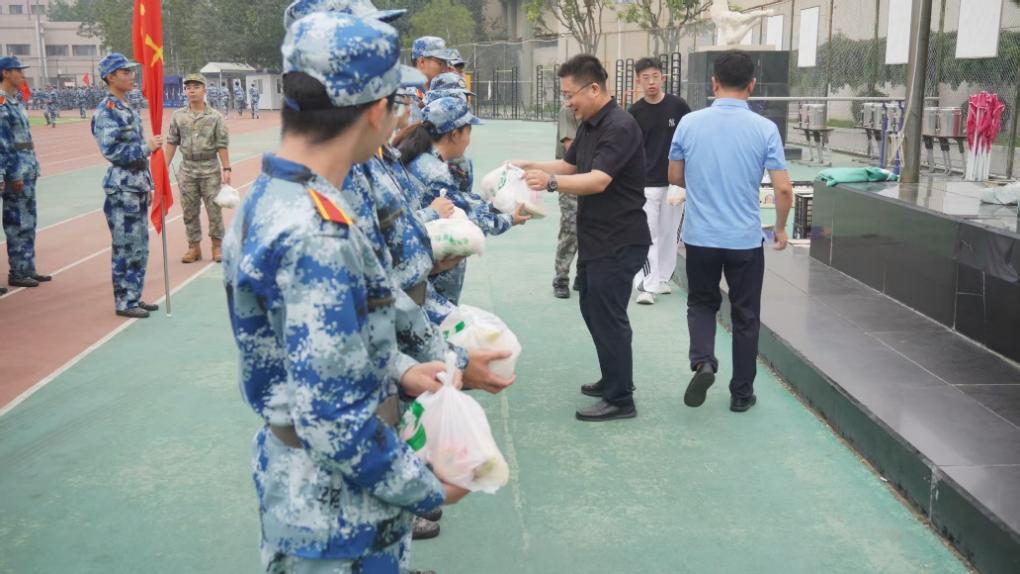慰问期间,叶海木书记、李永峰院长和韩瑾副书记向承训教官表达了诚挚感谢和崇高敬意,充分肯定了同学们在训练中展现出的吃苦耐劳精神和取得的显著进步,并向承训教官及受训新生分发慰问品。他们勉励2025级新生珍惜军训宝贵经历,在军事训练中锤炼意志品质,学习人民军队优良纪律和作风,不断增强组织纪律观念和集体荣誉意识。