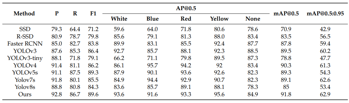 为了定量分析所提方法与其他方法的检测性能,在表1中给出了GDUT-HWD数据集上各项指标的实验结果。对比包括SSD、R-SSD、Faster RCNN、YOLOv3、YOLOv3-tiny、YOLOv4、YOLOv5s、YOLOv7s、YOLOv8s。以平均精度均值(mAP)评价指标为例,与其他方法相比,所提方法在5个类别中均取得了较高的检测精度。同时,在评估精度和F1分数时,所提出的方法与其他方法相比也在不同识别类别中提高了检测精度。如表2所示,在SHWD数据集上,当IoU阈值设置为0.5时,所提方法的检测准确率达到96.1%。在帽子类别和人类别上的准确率分别达到97.4%和94.9%。当IoU阈值在0.5 ~ 0.95之间时,mAP达到65.4%,比YOLOv5s提高了4.3%。为了进一步验证HR-YOLO的鲁棒性,在CUMT-HelmeT数据集上与SSD、Faster RCNN、YOLOv3、YOLOv5s、YOLOv7和YOLOv8s不同方法进行了对比实验。表3列出了不同方法的precision、recall、F1、mAP、Params和GFLOPs的值。从表中可以看出,与其他六种方法相比,我们的方法表现出最高的准确率、召回率、F1值、mAP@0.5和mAP@0.5:0.95。此外,在precision、recall、F1、mAP@0.5和map@0.5:0.95值上,与YOLOv5的结果相比,分别达到了3.8%、6.1%、5.1%、5.6%和7.7%的提升。