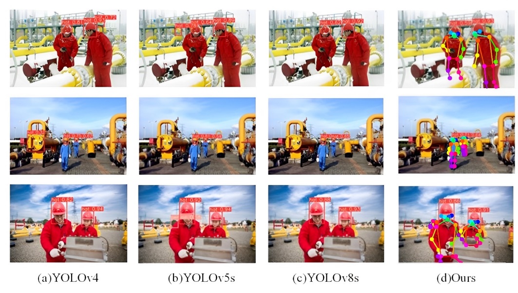 图6展示了HR-YOLO在室内场景中的应用。在加油站,工人经常在密集的管道附近工作,部分设备的形状类似于安全帽。实验结果表明,该方法能够有效地检测出复杂室内场景下安全帽佩戴情况。