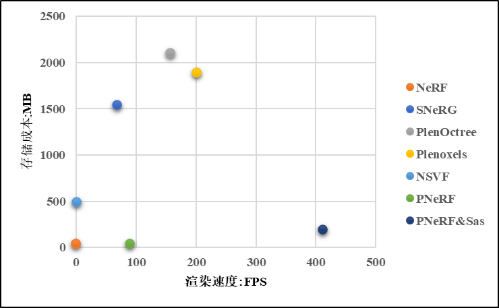 最后,在存储成本上的对比,如图6所示。PNeRF模型的存储空间大小仅仅只需保存网络权重的空间且渲染速率表现较优。