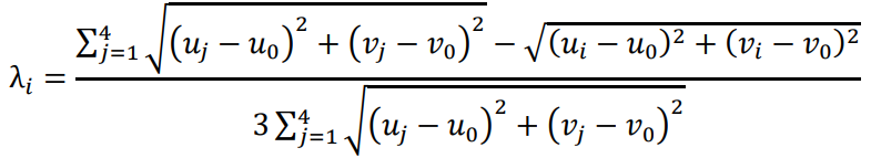 在四个顶点存储的视图中,对应相同坐标的像素颜色值ci会有一定差距。本研究使用距离场来描述插值点的视图颜色,通过顶点插值得到对应坐标上的颜色值,每个顶点对插值点颜色的贡献度与距离相关,且贡献度总和为1。则顶点贡献度表示为: