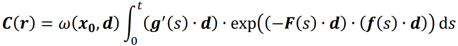 在方程式中,F(s)与f(s)分别为三维空间中体积密度函数与原函数在光线发射方向d上的梯度向量。