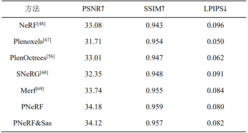根据LLFF数据集来进行实验并评估本章节的算法。首先,在渲染质量上,如图6所示,展示了真实的360度场景Horns与Trex的渲染结果对比,渲染质量评估数值对比见表2。
