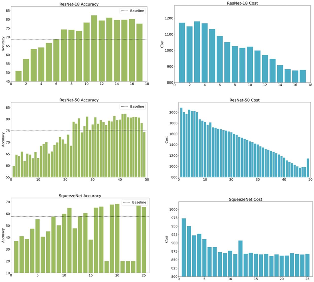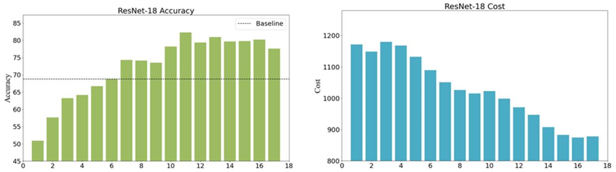 本文针对三种模型进行实验,包括了ResNet-18、ResNet-50和SqueezeNet。首先对层贡献进行分析得出微调方案,下图展示了各层对推理精度的贡献及对应消耗的时间。