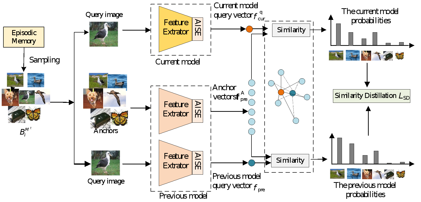 我们提出了一种相似性蒸馏损失,可以在经验回放过程中将查询点与先前模型中的锚点相比的相似性转移到当前模型,对抗灾难性遗忘。