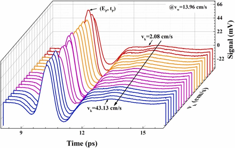 图4和图5为水相表观速度(vw)为13.96 cm/s时,改变煤油的表观速度时在微通道中部采样得到的稳定流动状态的油水两相流的太赫兹时域波形和相关参数。受油相速度的影响,油水两相在微通道内的相分布产生了变化,太赫兹光谱信号参数的上下波动反映了不同的流型转变。