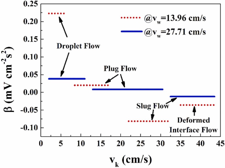 图6和图7展示了在固定煤油的表观速度的情况下,改变水相流速的实验结果。Ep的结果表明,该情况下仅出现了液滴流、塞流、段塞流三个阶段,两相流的流型模式强烈依赖于煤油的流速。因此,可以通过参数β=k/vw建立流型和THz-TDS测试结果之间依赖关系。