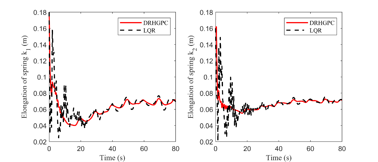 图4 张紧器不同机械性能时质量块一DRHGPC和LQR控制效果对比