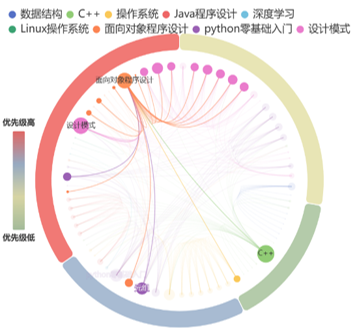 根据学生的编程行为画像为其推荐适合的编程题目如图7所示,可以根据词云图了解薄弱知识点,根据单轴气泡图选择适合难度题目进行练习。进而系统为其提供多门课程按照学习优先级展示在外层圆环上,如图8所示,根据课程节点之间的连接关系,可以确定某些课程的前置课程进行学习,更好的理解课程知识点。