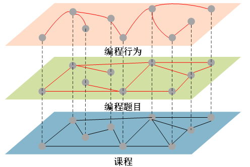 本文使用t-SNE降维方法将用户多平台特征信息降维到二维空间进行用户画像的聚类操作,为推荐系统提供先验参数。根据多元编程数据的特点设计了异构信息多层图,如图1所示。将数据整合输入到推荐系统中,并通过层间元路径进行特征聚合。根据用户当前的编程行为和答题情况进行题目与课程的推荐。