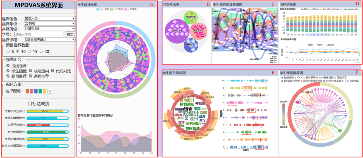 如图2所示,MPDVAS界面由首页控制台及6部分协同交互的可视化视图组成。用户可以在控制面板中配置角色,年级和班级等参数;用户可以根据目标达成度条形图确定培养计划或教学大纲是否需要调整,同时查看相应的视图分析问题并寻找可能的原因。视图A是对学生编程画像的整体概览,视图B、C、D展示了某个班级的编程课数据,视图E、F用于展示题目和课程推荐结果。群体用户编程及可视化行为的展示界面包括多维度环状热力图-雷达图、层次气泡图、扩展桑基图、对称堆叠柱状图-多维时间序列图、题目推荐词云图与课程推荐和弦图。