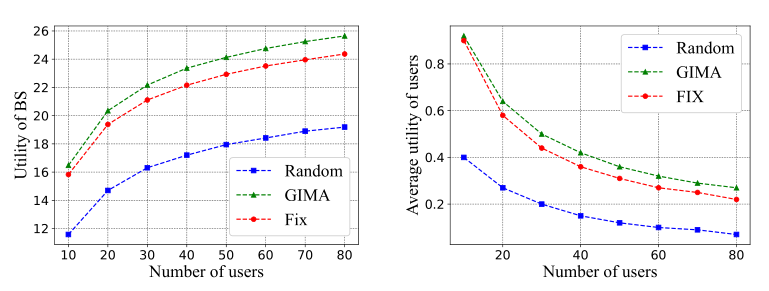 图3显示了基站和用户的效用变化情,展示了不同用户数下Random算法、GIMA算法和Fix算法效用。本文提出的的GIMA算法的基站效用是三种算法中最大的。随着用户数量的增加,GIMA算法与其他两种算法之间的效用差距越来越大。此外,GIMA算法的增长速度比线性增长慢。实际上,随着用户数量的进一步增加,越来越多的用户参与到联邦学习训练中,基站可以获得大量的计算资源。但是,为了获得最大的效用,基站所需的计算资源量会趋于稳定。此外,随着用户数量的增加,用户的平均效用减少。这是因为随着用户数量的增加,参与联邦学习训练的用户越来越多,而奖励的增长速度却持平。因此,用户的平均效用变小。可以明显看出,GIMA算法的基站效用是三种算法中最大的,GIMA算法与另外两种算法的用户平均效用差距越来越大。