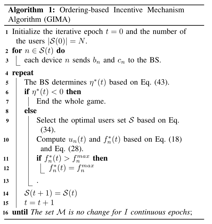 随后证明了纳什均衡的存在性以及Stackelberg均衡的存在,并且提出了一种基于博弈的激励机制算法(GIMA)来实现Stackelberg均衡,算法伪代码如下所示: