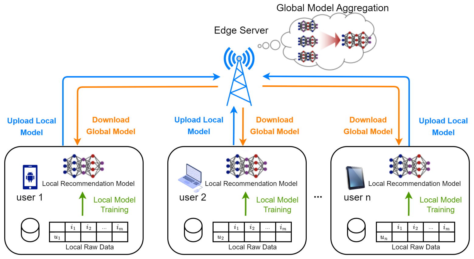 本文考虑蜂窝网络环境下推荐系统的典型联邦学习场景,如图1所示。它由一个带有边缘服务器的基站和多个用户组成。每个用户使用本地原始数据训练自己的本地推荐模型。然后,只将局部模型的参数上传到边缘服务器进行聚合,即可获得全局模型。最后,聚合的全局模型被发送回用户设备进行推理和下一次迭代训练。