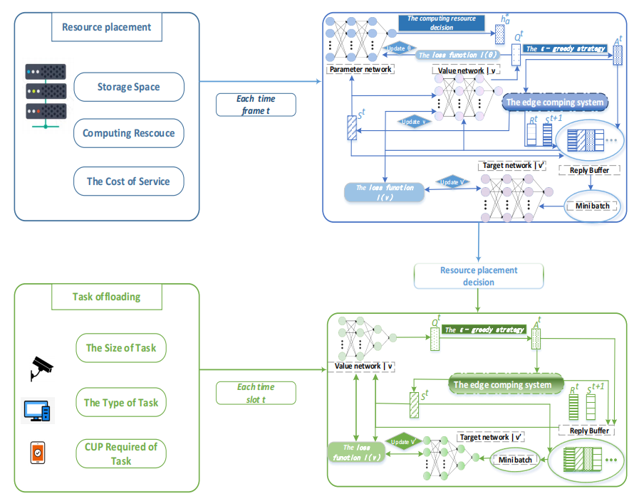 针对边缘计算系统的资源分配和任务卸载问题,采用基于深度强化学习的方法对资源放置和任务卸载过程进行优化,目标是优化资源分配和任务卸载过程中服务提供商成本。图1是本文整个处理过程的框架流程图。本文考虑到,相比较资源分配的动态变化,任务卸载过程中实时变化更快,因此利用双时间尺度模型分别对资源分配和任务卸载过程进行分析。为了满足用户的可靠性需求,在资源放置部分采用冗余的服务资源放置策略,确保存在正常的服务器能够为用户提供服务,任务卸载部分考虑了服务器故障对于处理任务延迟的影响。为了进一步优化资源放置和任务卸载策略,建立了资源分配和任务卸载模型,资源放置部分主要包括离散动作的服务放置决策和连续动作的计算资源分配决策的混合动作空间,而任务卸载部分中的任务类型判断和任务卸载决策均为离散动作空间。因此,采用两种深度强化学习的方法分别对资源放置和任务卸载过程进行训练,优化服务提供商的成本。通过实验证明了所提出算法的有效性。