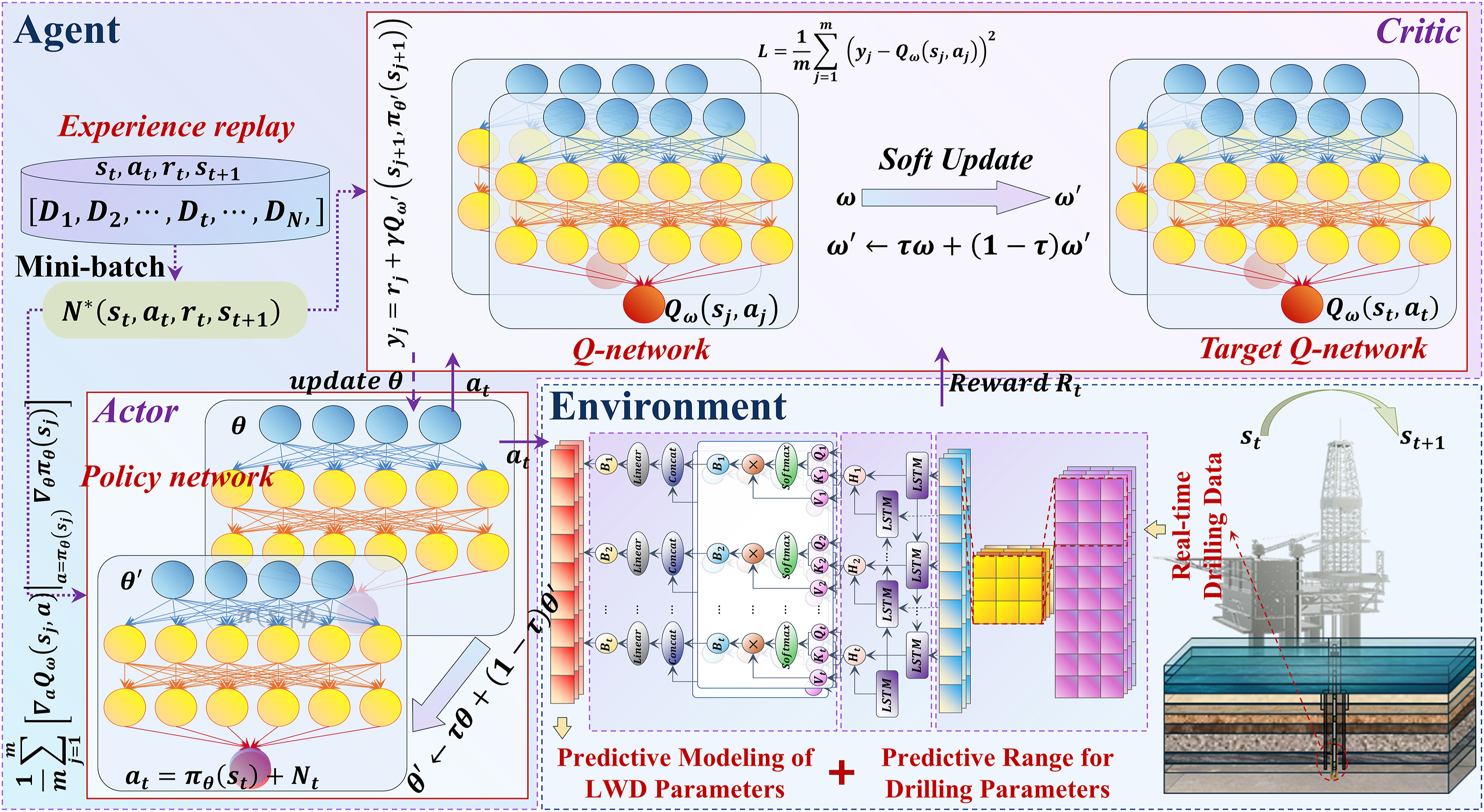 为有效优化钻井参数,采用高复杂度 MESR-DS 方程作为钻速估计器,利用 VMD-CNN-BiLSTM-MA 模型作为环境估计器,构建马尔可夫决策过程,从而设计了钻井参数优化—深度确定性策略梯度(DPODDPG)算法。该算法以每英尺成本和机械比能作为奖励函数,状态空间由 CNN-BiLSTM-MA-QA 模型预测的关键钻井参数潜在调整范围动态定义。