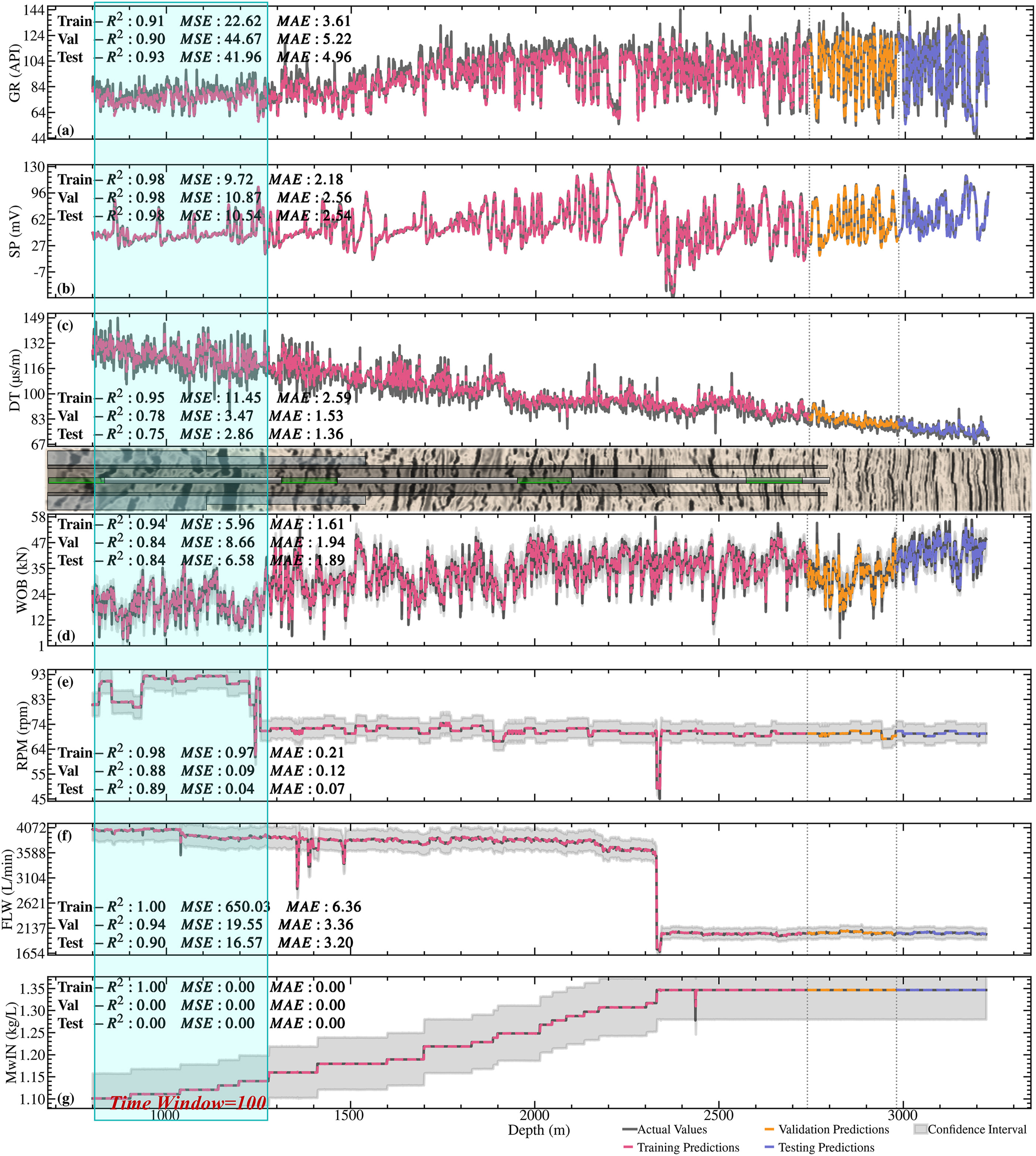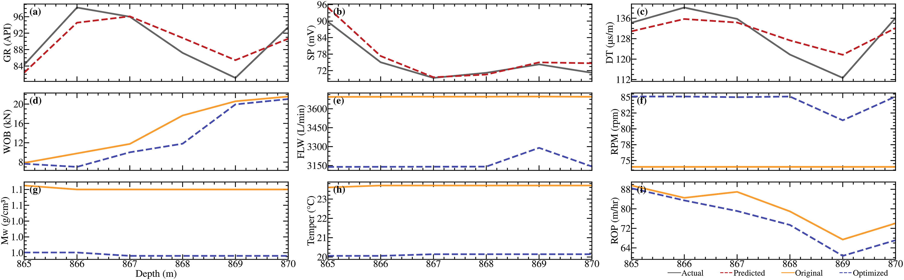 图5(a)–5(c)显示 GR、SP 和 DT 显著降低,表明钻遇较软地层。这些地质特征表明地层的强度和密度较低,这通常需要调整钻井参数以适应地层特征。在此类地层中,优化的钻井参数包括:降低 WOB、降低 FLW、提高 RPM 以及降低 MwIN 和 TemIN。图5(d)–5(f) 说明了这些调整的效果。降低 WOB 有助于减少对较软地层的过大压力,防止钻头快速磨损,同时保持良好的切削效率。降低泵流速可最大限度地减少井壁的侵蚀,同时保持钻井液的有效循环。提高 RPM 可以提高钻头的切削速度,以适应较软的地层特性。降低泥浆密度和温度有助于减少对井壁的压力,保持泥浆性能,并减少对钻头的热影响。上述调整反映了 DPODDPG 算法在优化较软地层钻井参数、提升钻井过程稳定性和效率方面的有效性。
