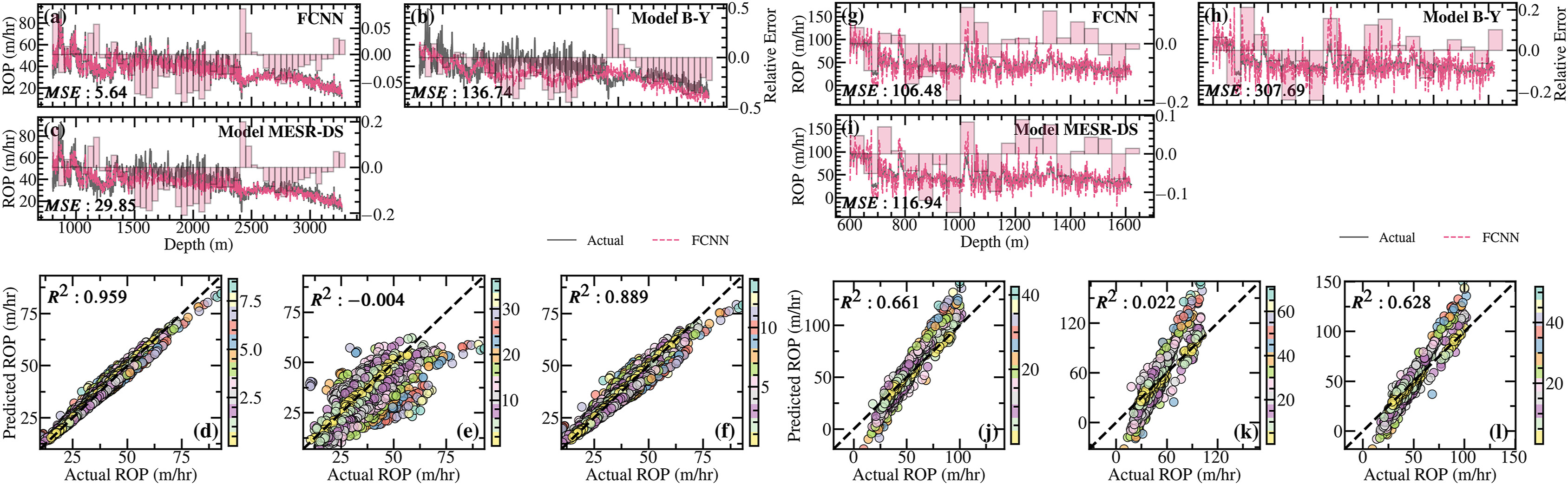 图 2 比较了 FCNN 模型与两种ROP 方程在训练井和邻井中的性能。结果显示,FCNN 模型在训练井中取得了最低的 MSE和最高的 R²,优于高复杂度的 MESR-DS 方程和经典的 Bourgoyne-Young 方程。这表明 FCNN 模型在准确性和数据拟合方面具有显著优势。尽管高复杂度 MESR-DS 方程未达到 FCNN 模型的性能,但在捕捉地质变异性方面明显优于 Bourgoyne-Young 方程,后者因固定的参数设置而限制了对新地质条件的适应性。在预测邻井的 ROP 时,FCNN 模型和高复杂度 MESR-DS 方程的 MSE 值显著低于 Bourgoyne-Young 方程的 MSE 值。这表明高复杂度的经验方程在泛化能力上与机器学习方法近似。