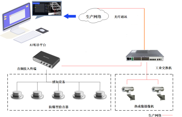 在阀室容易泄漏区域安装5台拾音器和2台红外热成像摄像机,拾音器对现场环境声音实时采集,红外热成像对特定区域温度进行实时追踪。如图4所示: