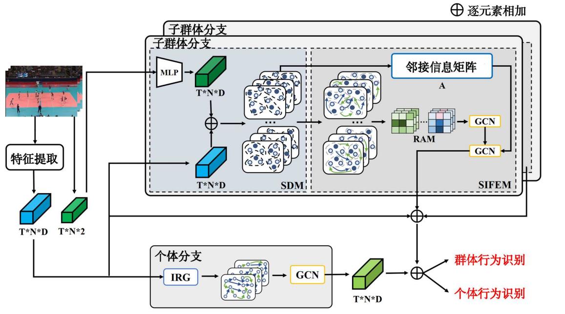 本文提出了一种名为多尺度子群体交互关系(MSIR)的群体行为识别网络。该网络包含两个关键模块:子群体划分模块(SDM)和子群体交互特征提取模块(SIFEM)。SDM通过融合空间位置和外观特征来动态地构造语义上相似的子群体。SIFEM则使用关系邻接矩阵来建模子群体间的交互关系,并引入关系注意力矩阵以筛选出判别性关系特征,从而提高识别的准确性。整体框架图如图2所示。