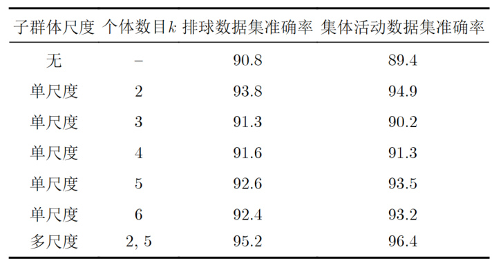 3.表3的实验定量比较了不同尺度子群体对群体行为识别性能的影响,相比不使用子群体的模型,准确率分别提升了4.4%和7%。这些结果证明了群体行为识别受益于多层次结构中子群体交互信息的利用。
