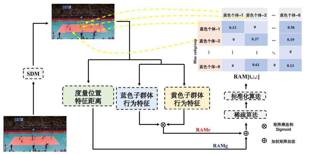 在交互特征学习阶段,采用了两个图卷积网络(GCN)层来聚合特征,以获得子群体的交互特征。第一层GCN根据RAM进行推理,计算得到每个子群体的交互特征。具体地,对于每对子群体a和b,计算其之间的RAM矩阵,并使用GCN层将子群体b的特征与RAM作为输入,从而得到子群体a的交互特征。类似地,使用相同的操作计算子群体b的交互特征。接着,为每个子群体定义邻接信息矩阵A,以建立当前个体与子群体中其他个体之间的连接关系。第二层GCN以第一层的输出和邻接信息矩阵A作为输入,输出最终的子群体交互特征。通过这一过程,得到了具有T×N×D维度的子群体交互特征,其中T代表时间步数,N代表子群体数量,D代表特征维度。其中交互关系矩阵的实现细节如图3所示。