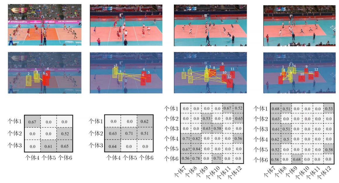 4.图4的可视化效果可以看出,RAM能够准确地捕捉并学习子群体之间的关键交互信息。例如,在第三列中,击球手和拦截者之间的关系具有较大的权重值,这种相互作用对于识别进攻的群体行为非常重要。