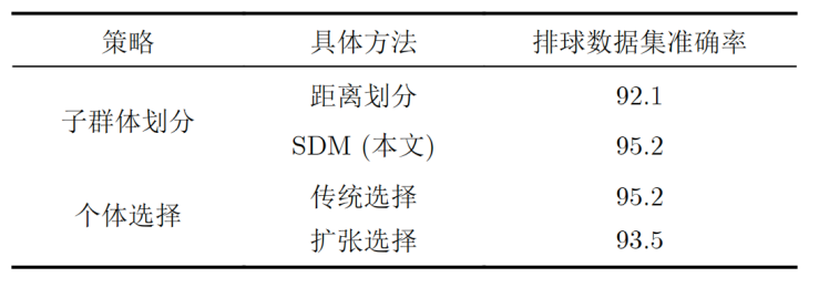 2.表2的实验验证了子群体划分模块(SDM)的有效性,结果显示其能显著提高识别效果。相比扩张选择策略,SDM划分的子群体因低相似度和低冗余度而表现更佳,最终选择k个最相似的个体组成子群体。