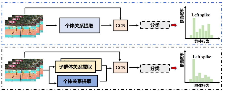 目前,群体行为识别领域面临着两个主要挑战:如何将多个个体划分为子群体并建立层次结构,以及如何捕捉具有判别性的个人交互特征。对于第一个挑战,通常采用基于层次结构的划分方法,例如,层次关系网络根据个体空间位置划分多个不同尺度的子群体。对于第二个挑战,许多方法利用个体的外观特征和空间位置来建模它们之间的关系,如关系图方法利用点乘法来度量特征相似度。然而,过去的方法通常仅考虑了子群体之间的空间位置关系,忽略了行为的相似性和子群体的动态变化。此外,对于交互关系的建模,以往的方法主要关注个体之间的关系,却忽略了对子群体之间关系的深入研究。因此,如图1所示,本文提出从动态子群体的角度入手,以更好地建模子群体之间的交互关系,为群体活动识别领域提供了新的解决方案。