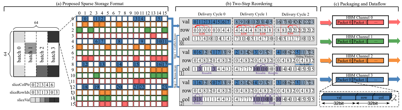 我们设计了一种两步重排序算法:(1)冲突感知的行重排算法,利用无冲突滑动窗口减轻了RAW的影响;(2)重用感知的排重排算法,通过收集可重用元素提高了向量的重用性。此外,我们采用循环数据流分配方式,以减少并发访问带来的HBM通道冲突。