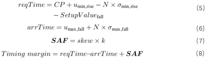 SD-SSTA算法计算指定时序路径终点处的时序宽裕量。对于图2(a)中的上升沿触发的触发器,在DFF/D处下降信号的时序宽裕量应用以下公式进行计算。