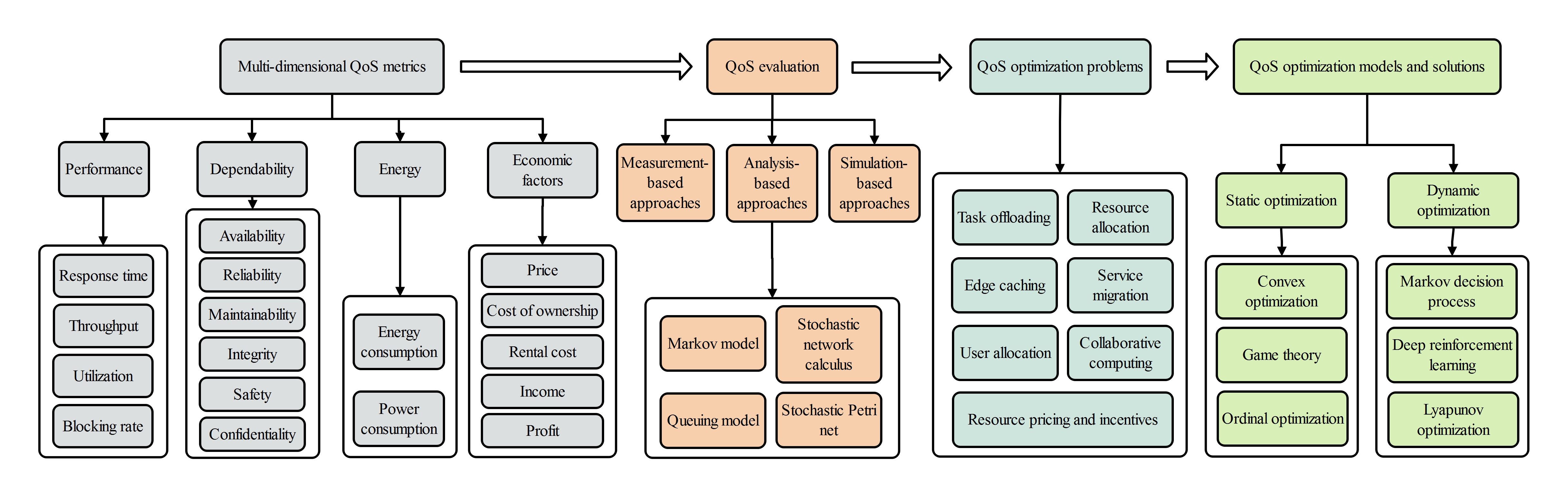 如图1所示,本文对物联网MEC多维QoS评价和优化问题进行了全面综述。首先讨论了多维QoS指标,将QoS指标分为四个维度,即性能、可靠性、能效和经济因素,其中,每个维度中还包含多个属性。本文给出了各个属性的定义,并讨论了各个属性之间存在的相互关系。
