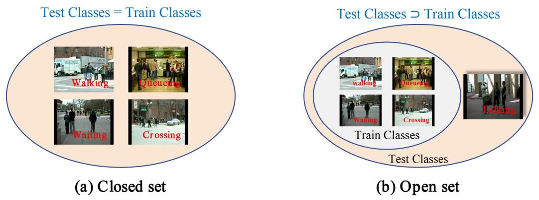 尽管现有的群体行为识别模型取得了重大进步,但在识别训练数据中未包含的行为方面仍存在一个显著的挑战。图1揭示了在群体识别任务中开集与闭集场景之间的差异,突出了在闭集环境下训练的传统模型在适应现实生活应用方面的局限性。在闭集场景中,模型基于一组固定的类别进行训练,并假定所有遇到的行为都属于这些预定义的类别之一。而在开集场景中,模型必须能够识别那些在训练数据中未出现过的行为,并将它们视为新颖或未知类别。因此,迫切需要设计一种能够在开集环境下运作的群体行为识别模型,以克服传统方法在处理未知类别时遇到的固有局限。在这种情况下,开集群体活动识别被定义为一个计算任务,其目标是识别和分类群体内的集体行为,特别是针对那些在训练过程中未预定义的未知行为。这一创新方法旨在提高群体行为识别模型在动态多变现实环境中的适应性。