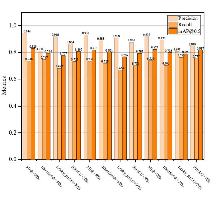 由于激活函数对稀疏训练有显著影响,我们将激活函数替换为Mish/HardSwish/Leaky ReLU/RReLU进行稀疏训练,并将剪枝率分别设置为30%、50%和70%。我们进行了消融实验,以比较不同激活函数对稀疏训练下模型检测性能的影响。实验结果如图6所示。