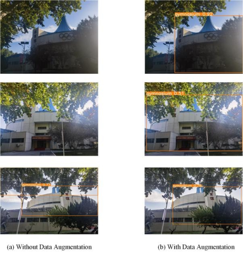 我们以体育馆为例,如图4(a)所示,两张图像显示出漏检现象,而另一张图像显示出现假阳性。然而,通过数据增强,图4(b)中的体育馆被成功检测。