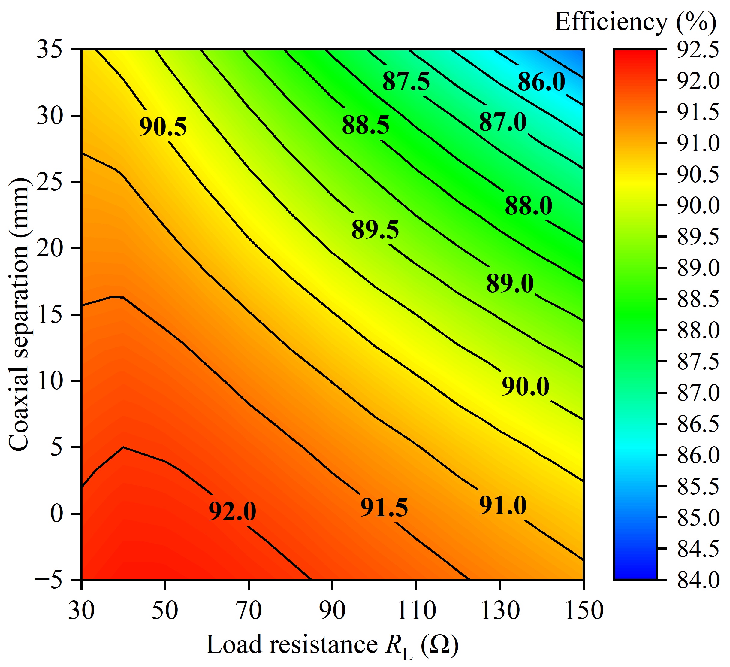 图5为负载电压UL随线圈分离和负载变化的曲线。本文提出的旋转式WPT系统在极端情况下电压变化范围为13.4%,参照国际标准EN 61000-3-3:2013和中国标准GB/T 12326-2008,该值在要求的±7%的标准限值内。图6为效率变化曲线,整体系统的平均效率为90.1%,在磁耦合机构偏移和负载变化情况下系统仍能保持高效稳定的电力输出。