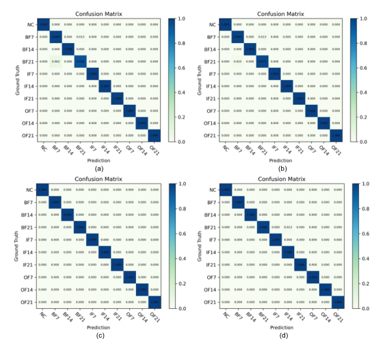 为了进一步评价VSTNN的故障诊断结果,图2给出了4个数据集上最佳情况下VSTNN故障诊断结果的混淆矩阵。行显示样本的实际故障类别,列表示VSTNN预测的轴承故障类别。从结果可以看出,大部分误分类类别集中在“BF”故障类别上,这表明该故障类别是轴承故障诊断的一个挑战。