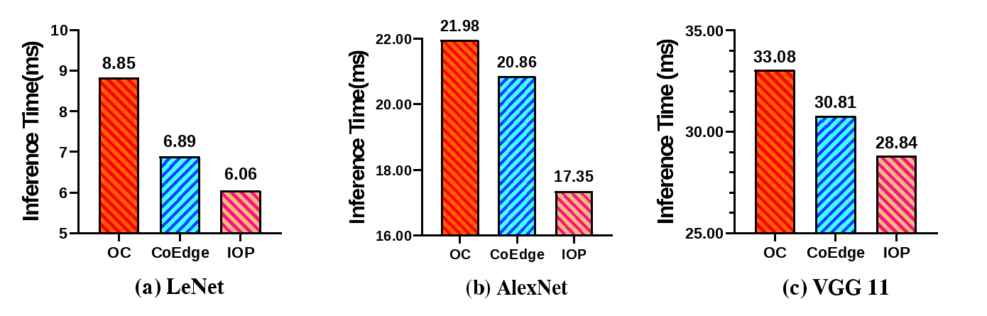 本文介绍了IOP,一种适用于CNN协同推理的低延迟模型划分策略。通过在相邻算子间采用IOP,减少了设备间多次建立通信连接所带来的开销,从而降低了模型推理延迟。我们将IOP最佳划分策略的搜索方案描述为组合优化问题。为有效解决该问题,我们设计了一种算子配对算法,以找到最优的模型划分策略。实验结果表明,对于LeNet、AlexNet和VGG11这三种广泛应用于图像分类的CNN模型,IOP相比最先进的CoEdge方案,实现了6.39%至16.83%的推理加速,并节省了21.22%至49.98%的峰值内存占用。