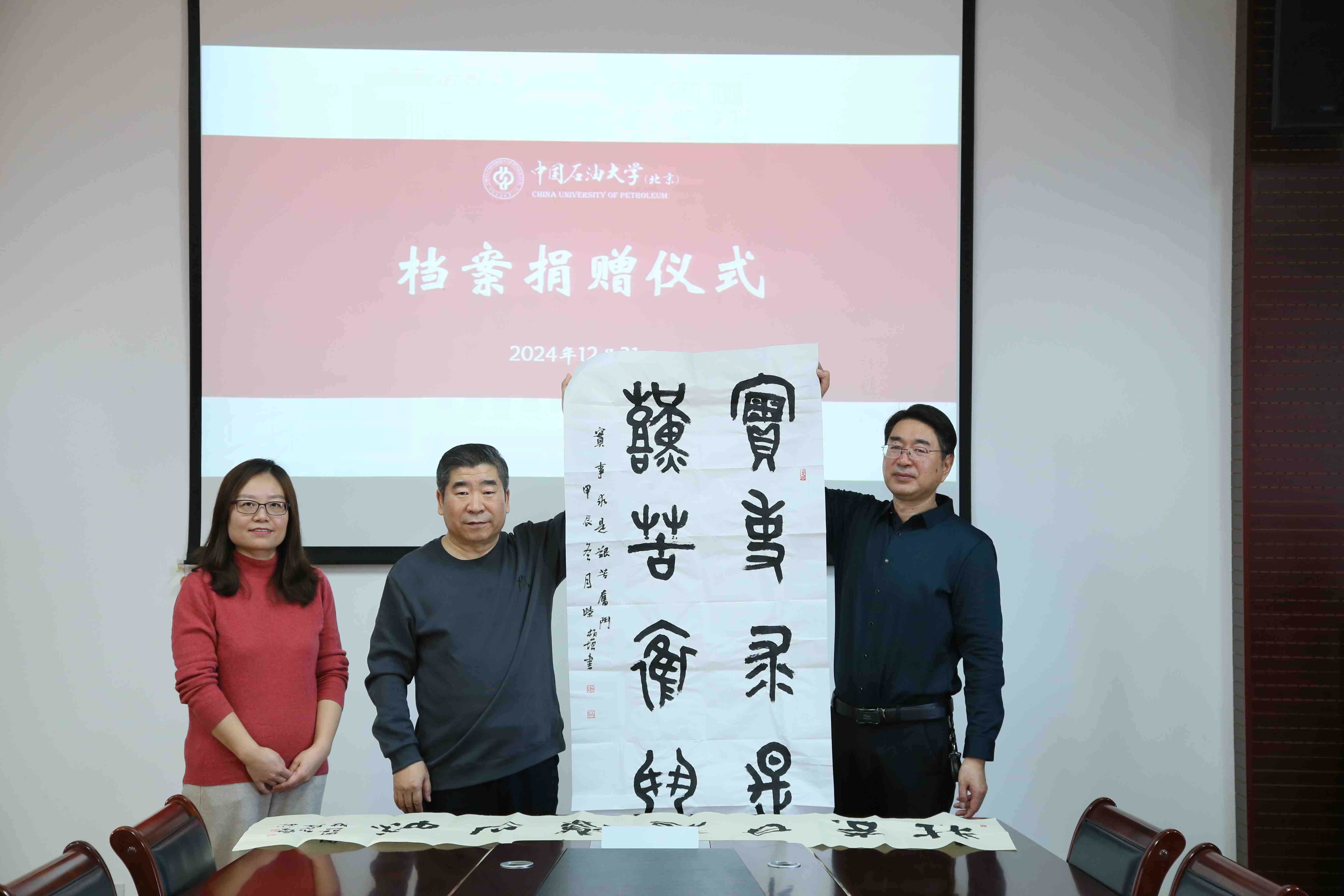 仪式上,柴柏增捐赠了由其书写的两幅金文大篆字体的书法作品《我为祖国献石油》(学校校歌名称)和《实事求是 艰苦奋斗》(学校校风)。海凤、宋刚代表图书馆(档案馆)接受捐赠,并为柴柏增颁发捐赠证书。
