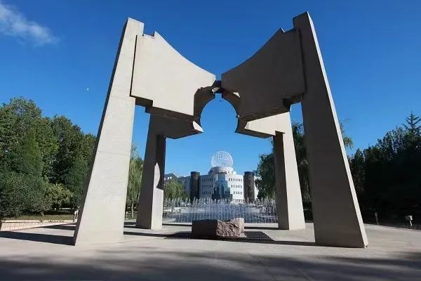 青年园南侧的“开启智慧之门的钥匙”与青年园北侧图书馆遥相呼应。钥匙形立柱隔空簇拥图书馆顶端地球造型。四座钥匙形立柱分别象征着当时SUNBET申搏官网的四大优势学科——石油地质、石油工程、石油化工与石油机械,立柱下方中央的长石下有水泵带动喷水池中的水穿过石孔流出,寓意为石油滚滚流。