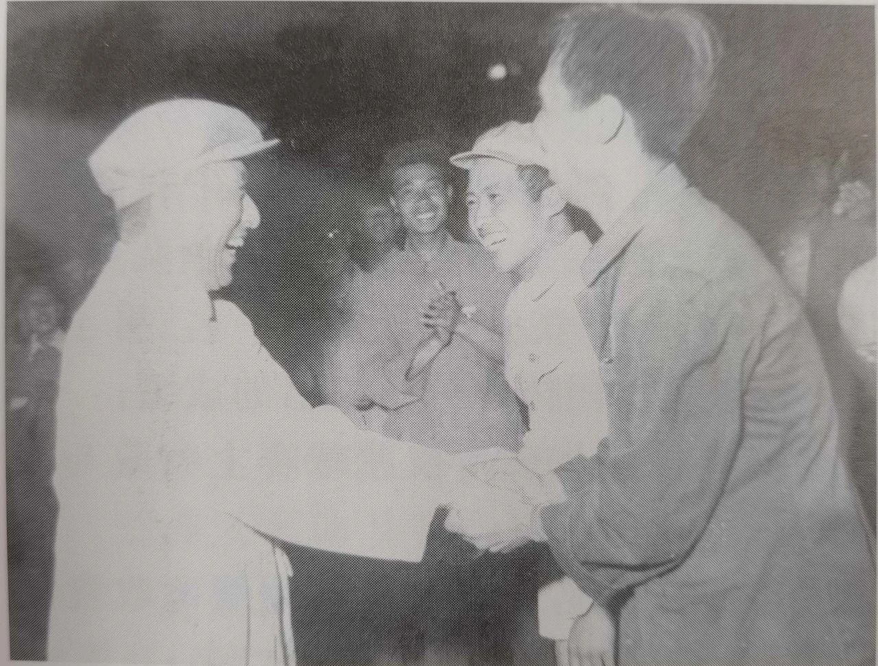 1960年高校运动会,北京石油学院体育代表队凯旋归来,孙卓夫副院长与领队吴林祥热情握手