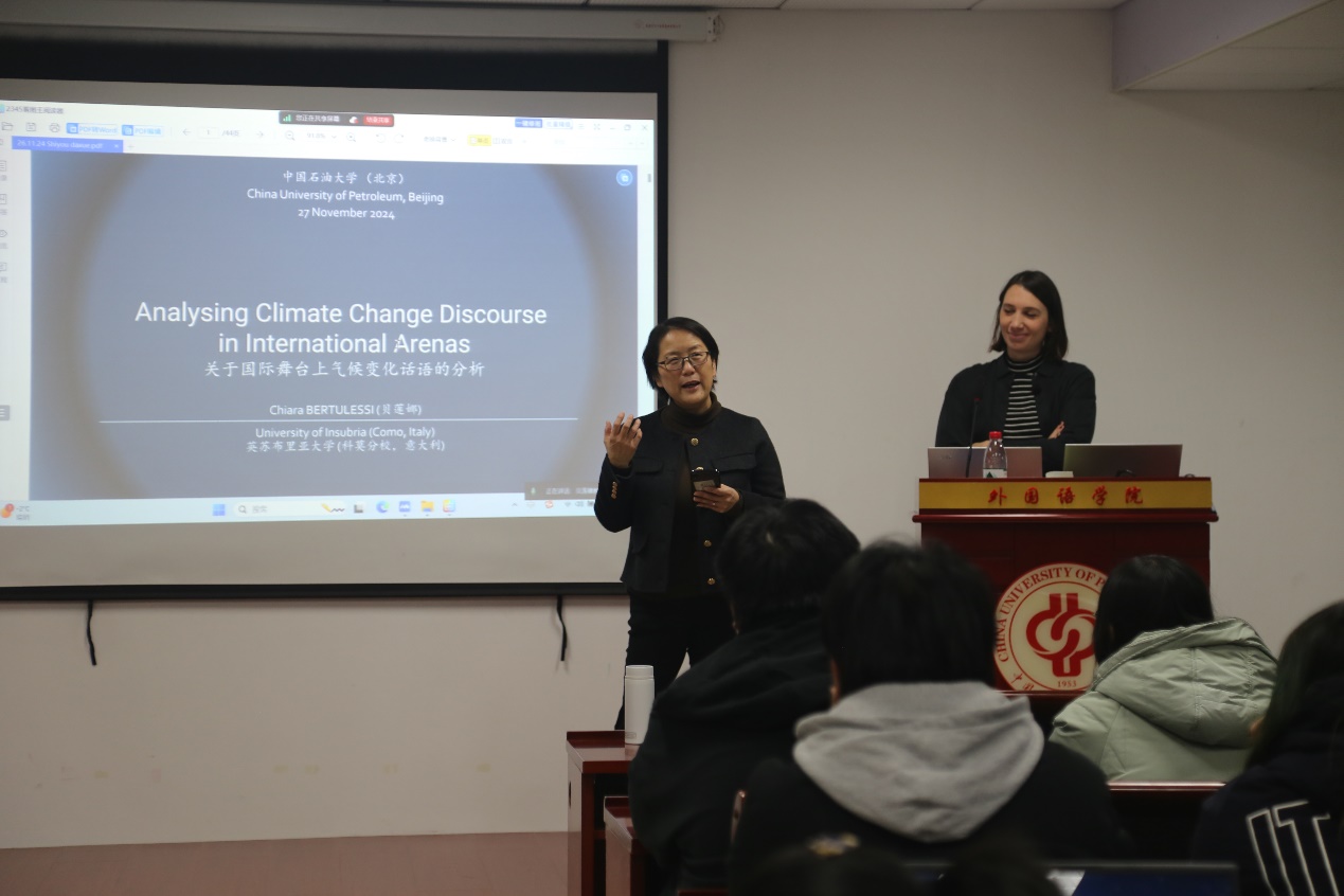 11月26日,外国语学院开展第69期博雅讲坛,意大利因苏布里亚大学(University of Insubria)Chiara Bertulessi助理教授受邀以“Analysing Climate Change Discourse in International Arenas: A Focus on UN Contexts”为题做了主旨报告,学院院长赵秀凤教授主持讲座,田海龙、崔亚霄等80余名师生参加讲座。