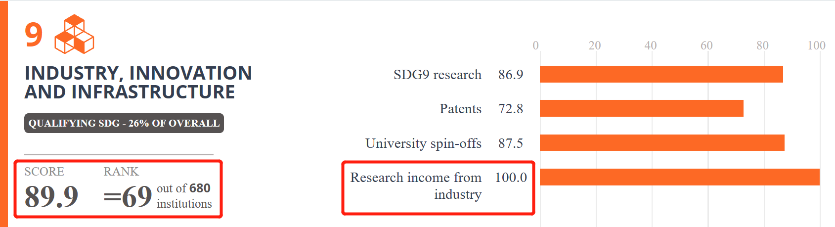SDG9 measures universities' research on industry and innovation, their number of patents and spin-off companies and their research income from industry. In SDG9, CUP scored 89.9 in total, 85% higher than the median, and scored 86.9, 72.8, 87.5, and 100 respectively in research, patents, university spin-off companies, and industry revenue, continuing its fast development trend in industry-university-research cooperation.