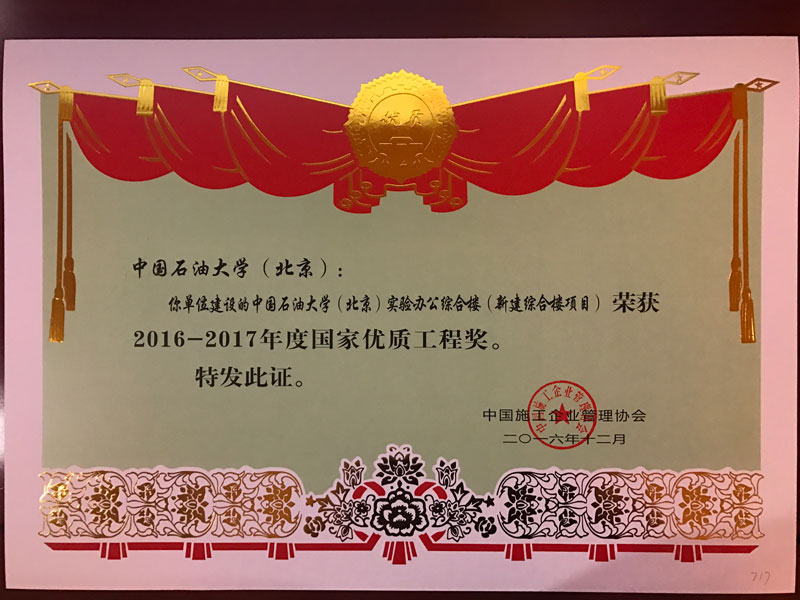 近日, 经中国施工企业管理协会组织专家评审,石大“新建实验办公综合楼项目”荣获2016-2017年度国家优质工程奖,该奖项全国范围涉及高校基建项目共11项,是我校第一次荣获该奖项。该工程项目总建筑面积72000平方米,地上15层、地下2层框剪结构楼,2009年取得立项批复和可研批复,2012年3月取得建筑规划许可证,11月取得施工许可证并开工建设,2015年2月竣工,3月份投入使用。该工程的总承包单位为北京建工集团有限公司,设计单位为华南理工大学建筑设计研究院,工程监理单位为北京鸿厦基建工程监理有限公司。此前,本工程项目已先后荣获北京市“结构长城杯”金质奖、“建筑长城杯”金质奖两项质量奖项;全国建筑业绿色施工示范工程、北京市建筑业新技术应用示范工程两项科技奖项;全国工程建设项目优秀设计成果三等奖、北京市绿色施工安全文明样板工地称号。