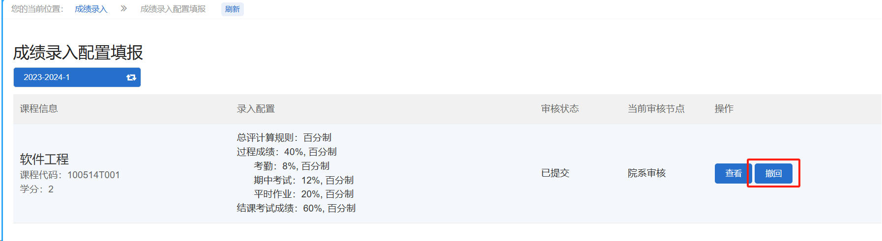 1.进入成绩录入配置填报功能后,点击课程后的“填报”按钮进行填报。若此处没有显示对应课程,请联系学院教学秘书维护课程对应的课程负责人