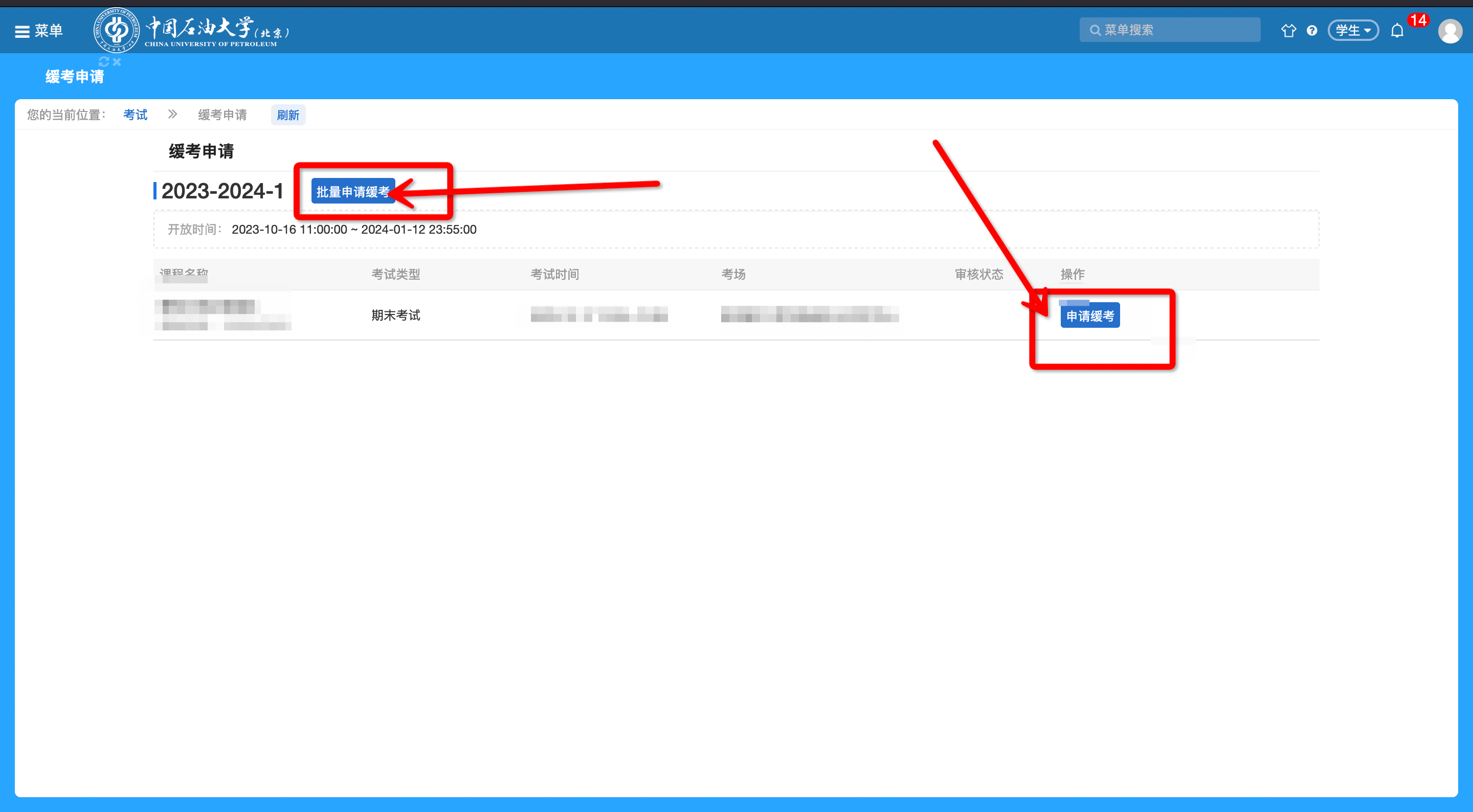2.点击申请缓考或者批量申请缓考填写对应的信息提交,审核通过后即为缓考办理成功